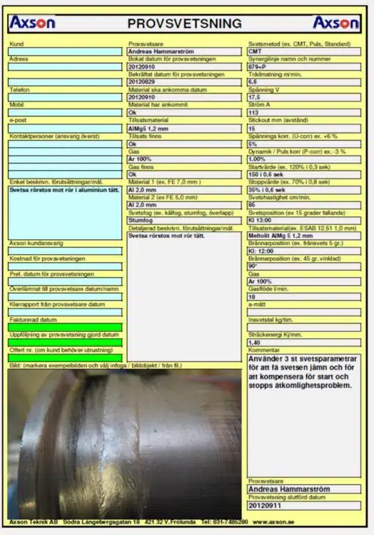 Efter avslutad provsvetsning upprättas ett protokoll med alla parametrar för att kunna överföra detta till produktionen.